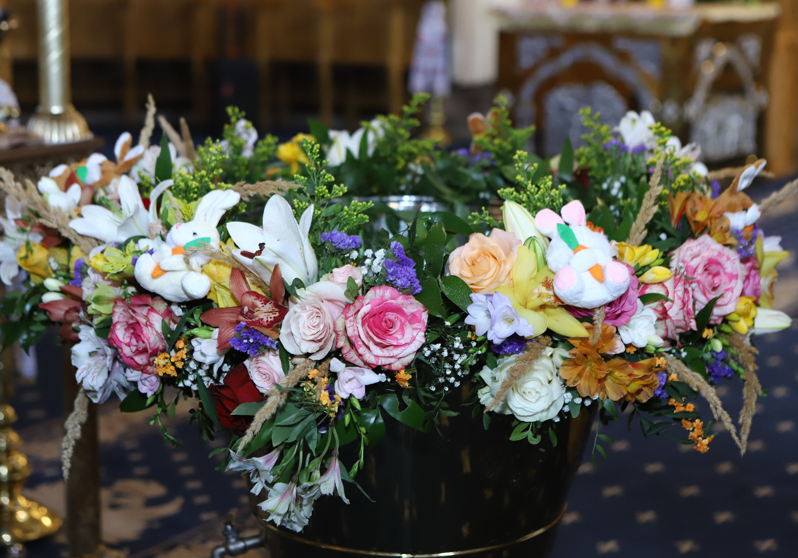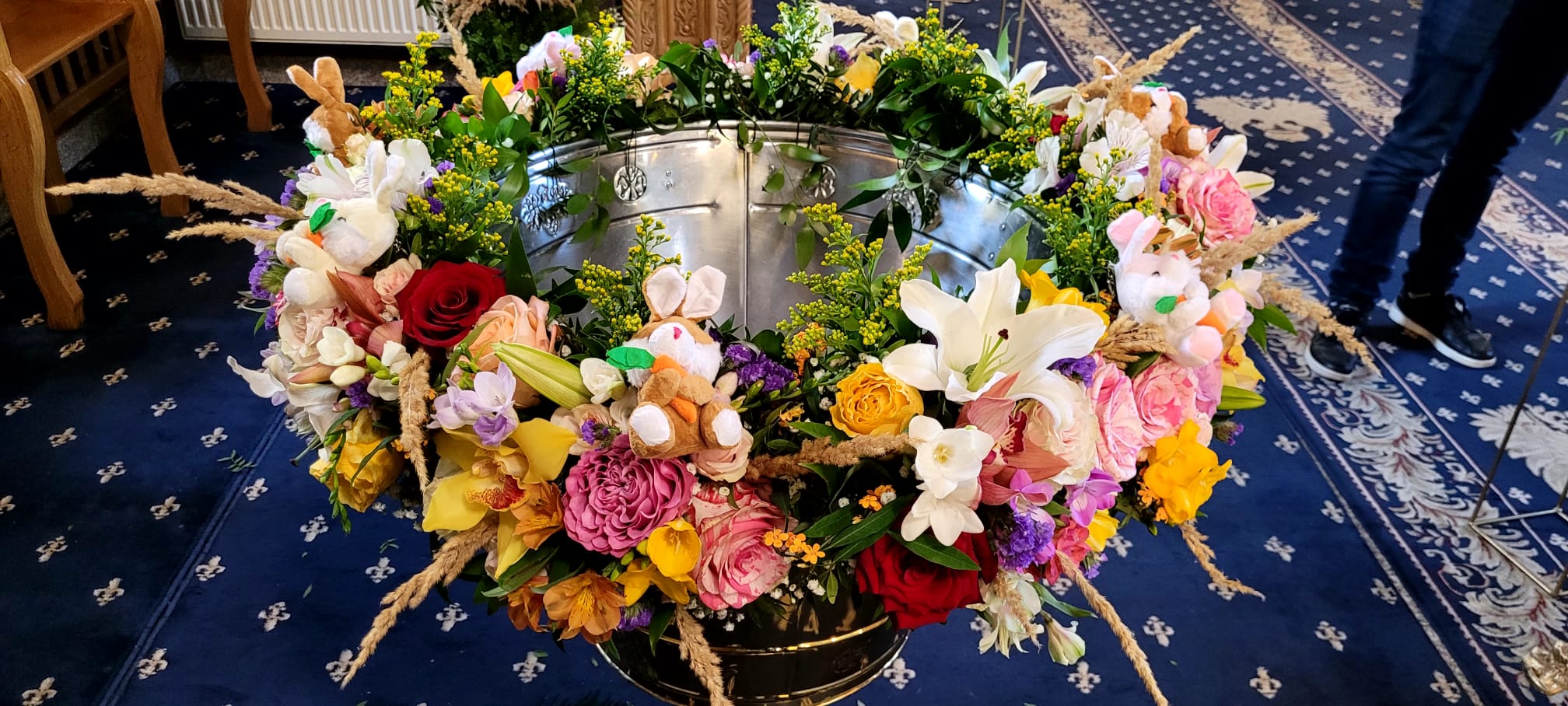 Acest aranjament cristelniță colorat pentru botez aduce bucurie, energie și culoare în momentul special al creștinării. Realizat manual dintr-o combinație bogată de flori naturale – trandafiri, crini, frezii, alstroemeria, orhidee, eustoma și ranunculus – aranjamentul este completat cu jucării de pluș în formă de iepurași, care oferă o notă ludică și adorabilă, perfectă pentru botezurile copiilor.