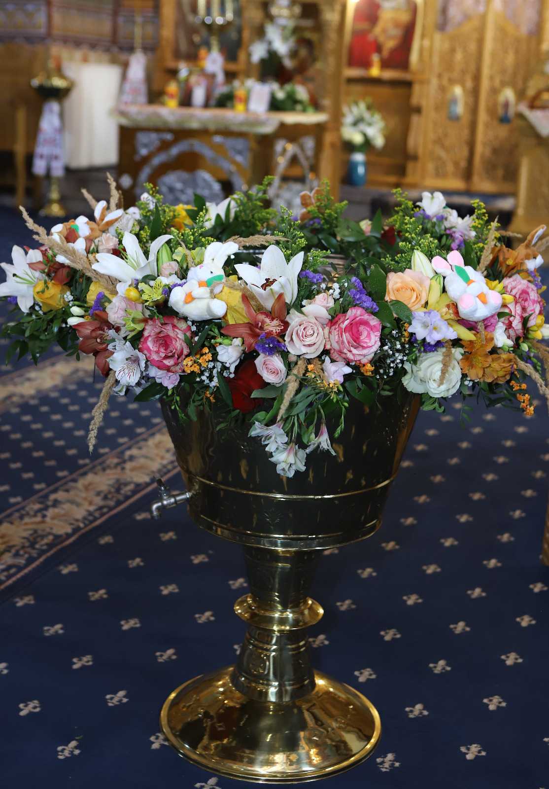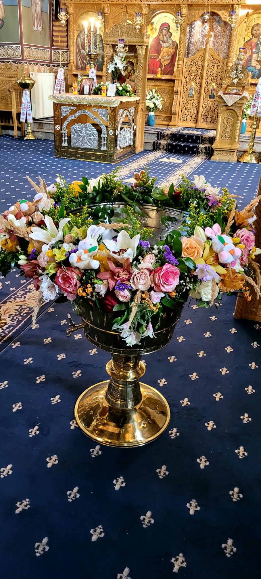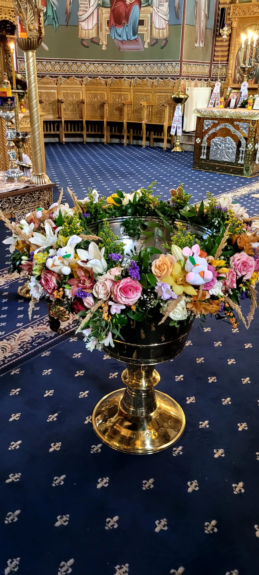 Prin combinația unică dintre eleganță florală și detalii ludice, acest aranjament transformă cristelnița într-un decor memorabil, simbol al purității și bucuriei copilăriei.