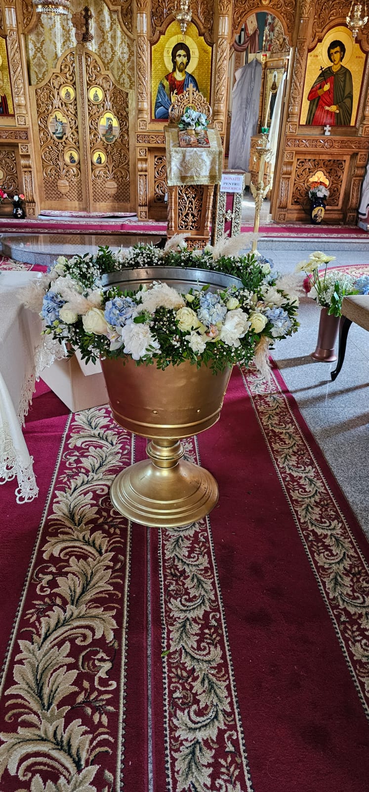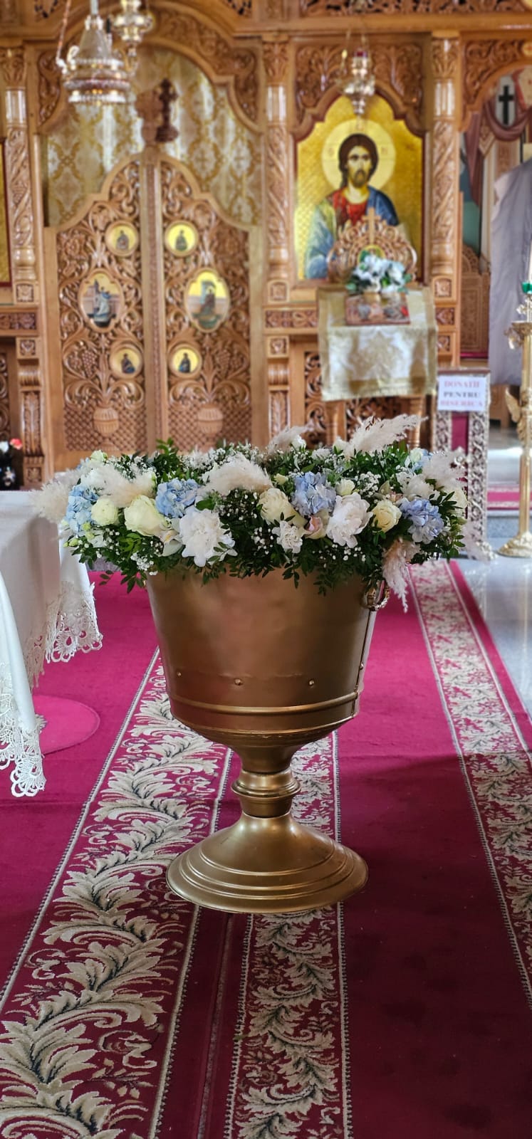 Compoziția este dispusă simetric în jurul cristelniței, oferind un efect bogat, dar aerisit, care completează cu eleganță decorul bisericii. Florile albe simbolizează puritatea și binecuvântarea, în timp ce nuanțele de albastru pastel transmit calm, protecție și pace – simboluri ideale pentru momentul sfânt al botezului.