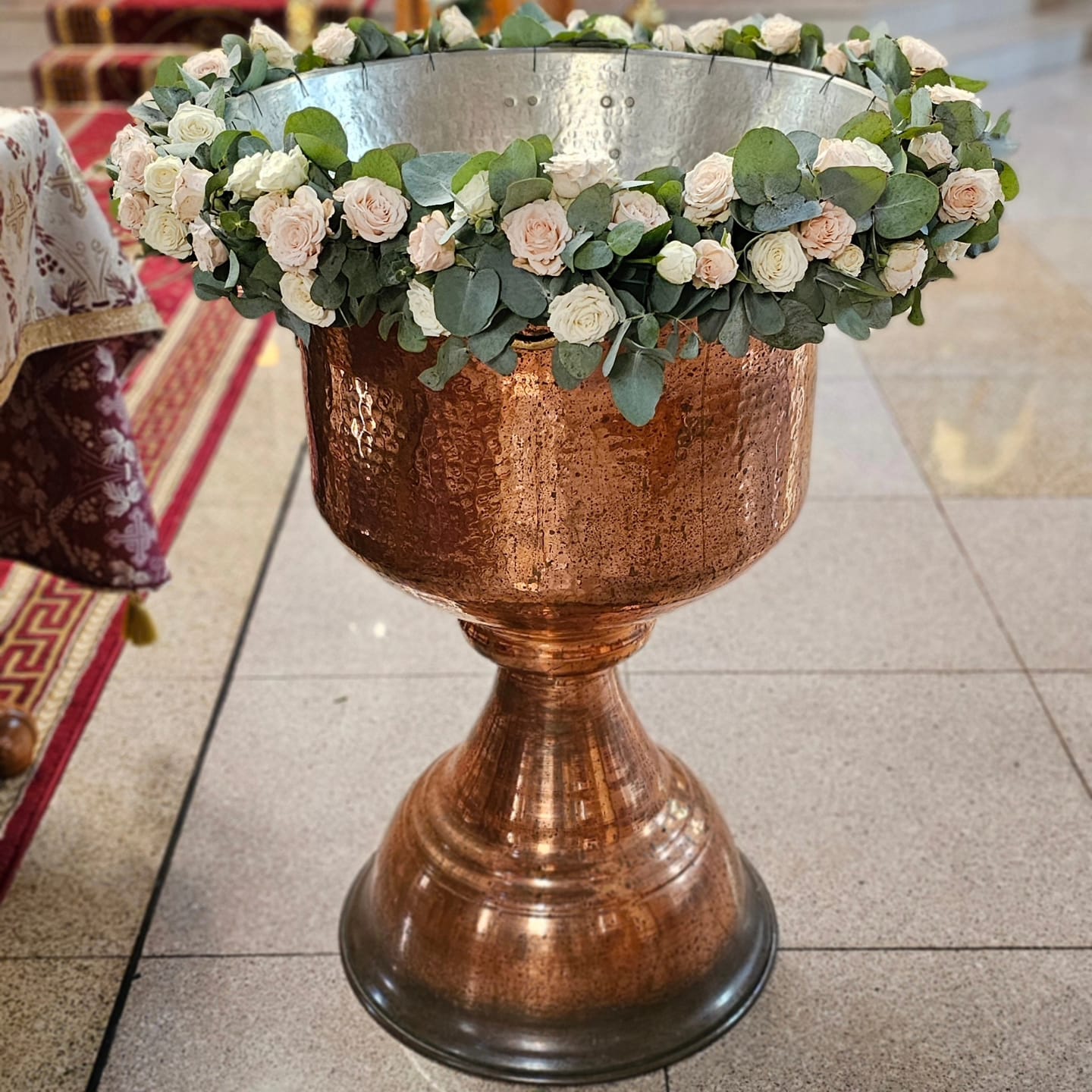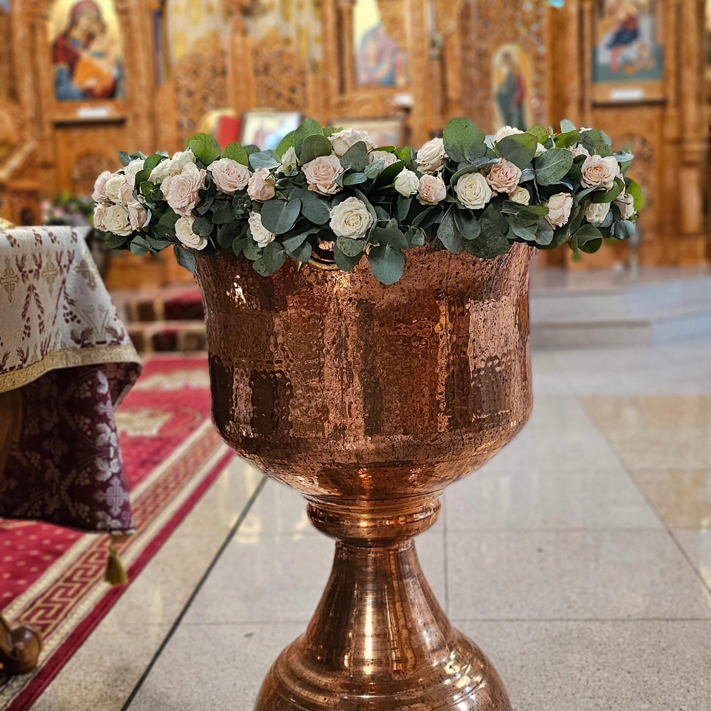 Cu o frumusețe subtilă și un rafinament natural, acest aranjament transformă cristelnița într-un punct central de eleganță și lumină, completând perfect atmosfera plină de emoție a botezului.