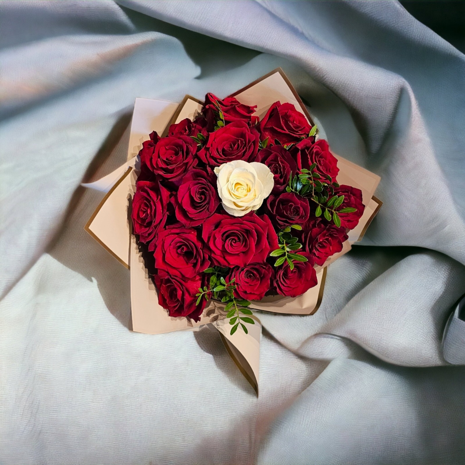 Un buchet elegant și simbolic, creat pentru a transmite iubire, respect și intenție serioasă. Cei 18 trandafiri roșii Explorer reflectă pasiunea și intensitatea sentimentelor, în timp ce trandafirul alb Alb Mondial, plasat central, sugerează echilibrul, puritatea și sinceritatea din relație.