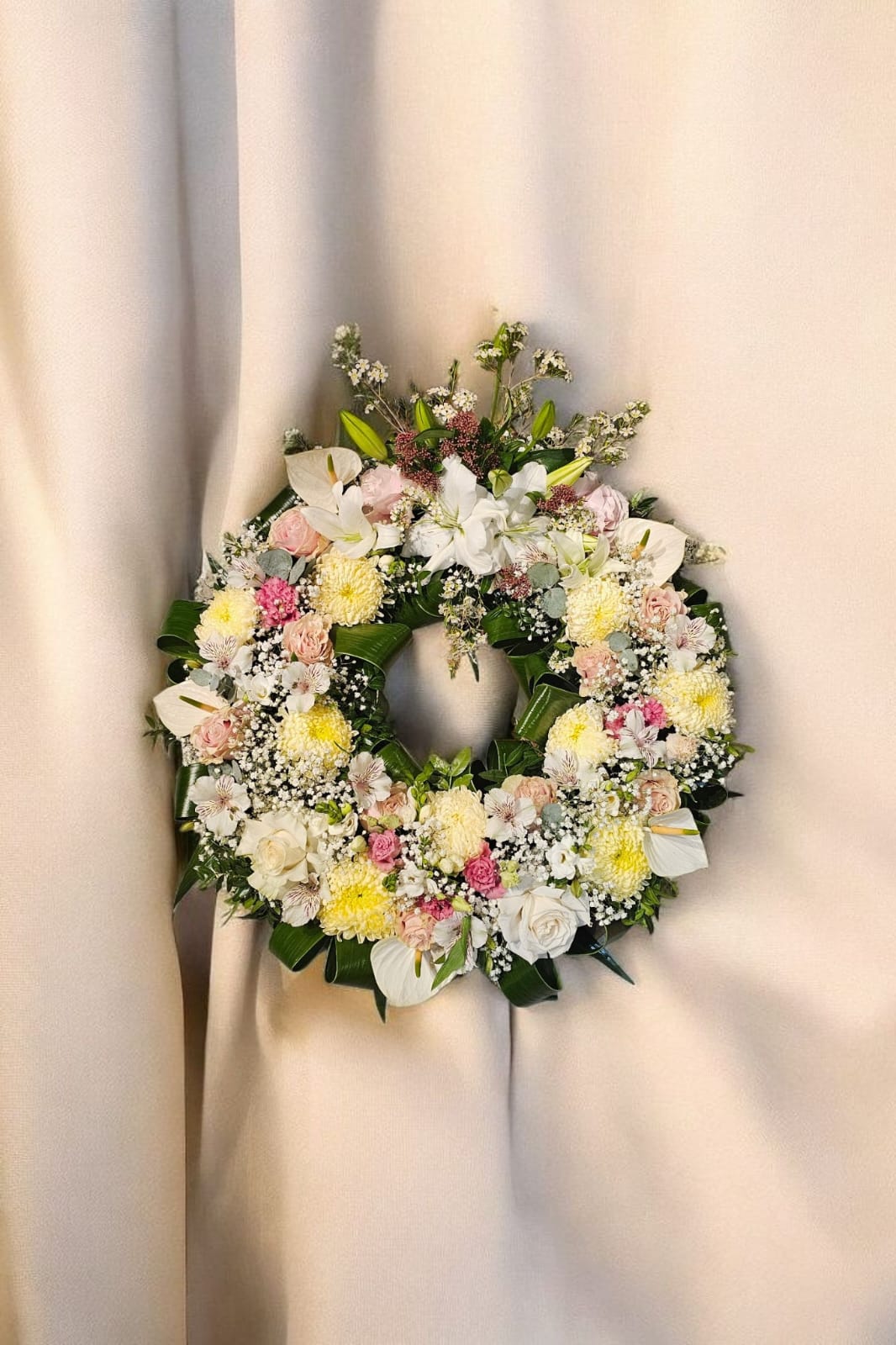 Această coroană funerară rotundă de 50 cm este o alegere elegantă și luminoasă, menită să exprime compasiune și iubire veșnică. Realizată manual din trandafiri în nuanțe pastelate, crini albi, crizanteme crem-galbene și anthurium delicat, compoziția transmite pace, respect și un omagiu profund.