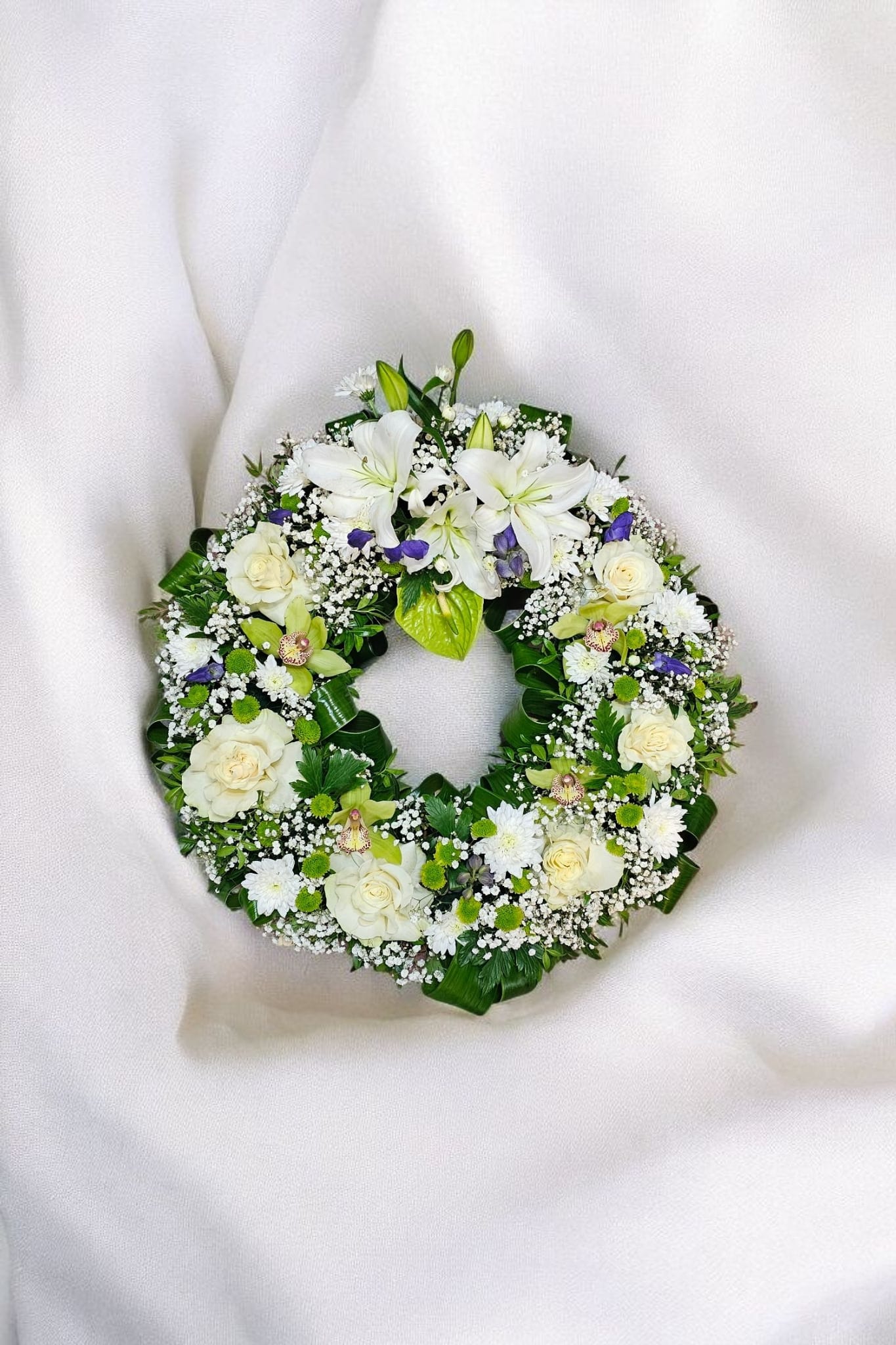 Fiecare floare este aranjată cu atenție pentru a reda echilibru vizual și emoțional, oferind un omagiu floral plin de grație și demnitate. Coroana este potrivită pentru ceremonii funerare, comemorări și depuneri la mormânt, aducând un mesaj sincer de iubire și recunoștință.