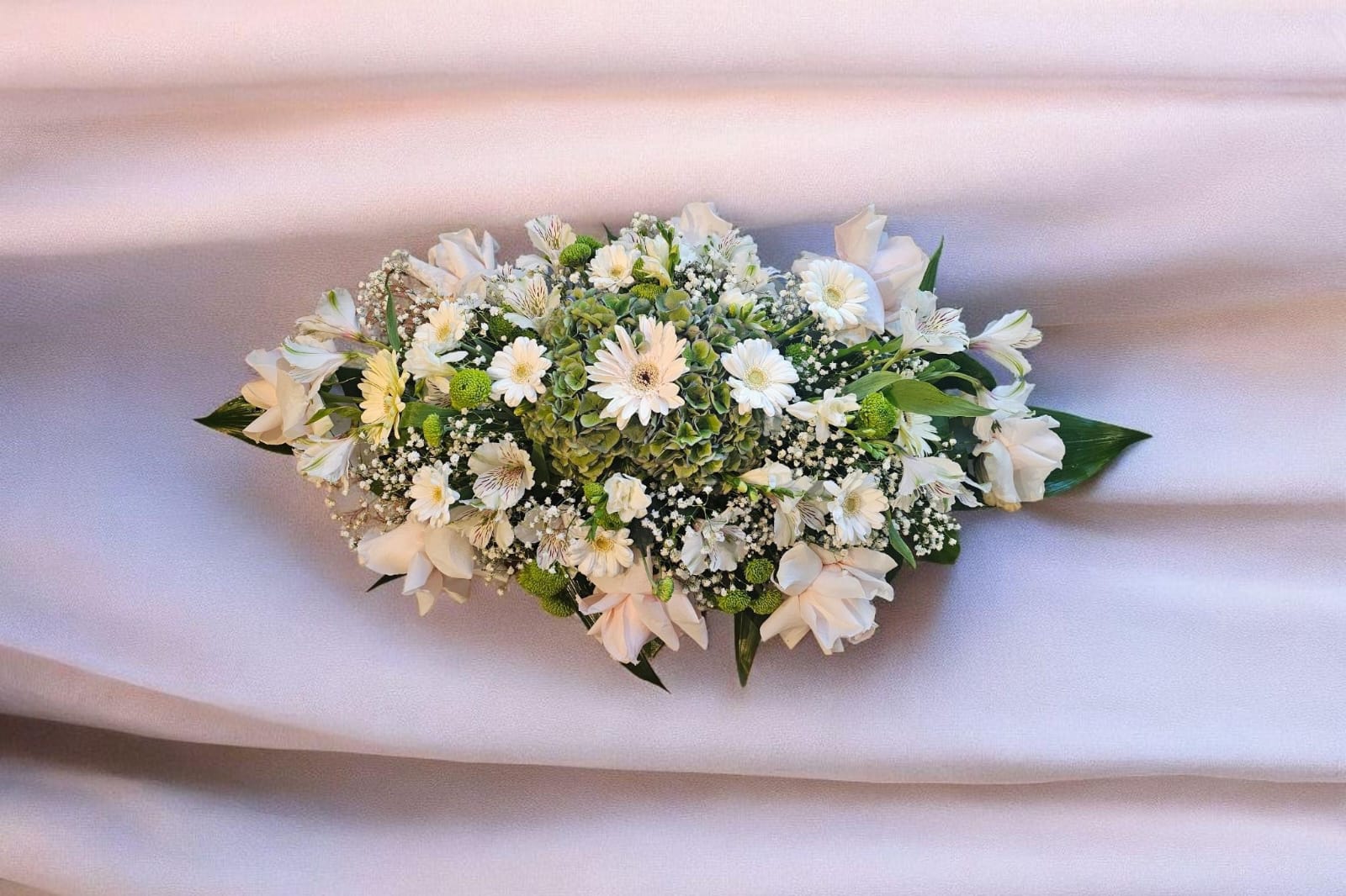 Această jerbă funerară de 100 cm lungime reprezintă un omagiu plin de rafinament și simplitate. Realizată manual dintr-o combinație armonioasă de trandafiri albi, hortensie verde-pal, alstroemeria, fresii delicate și gerbera, transmite un mesaj de pace, speranță și recunoștință.